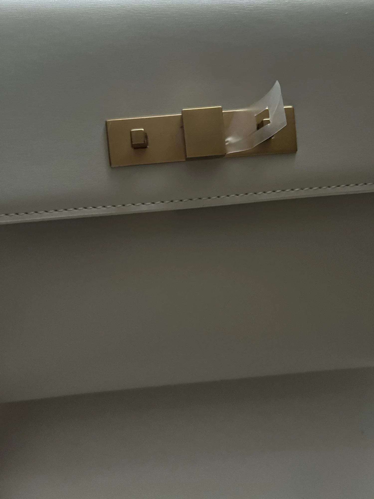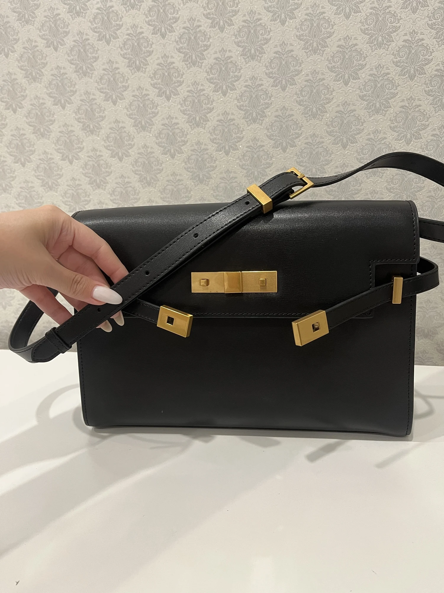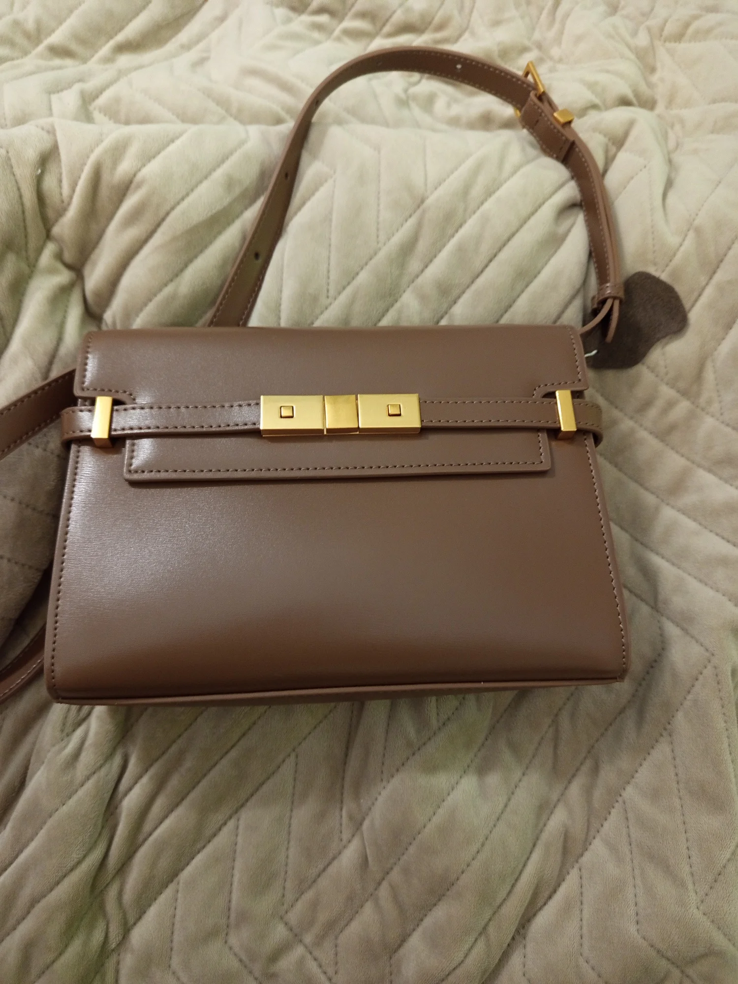 * Front strap closure with gold-tone lock hardware