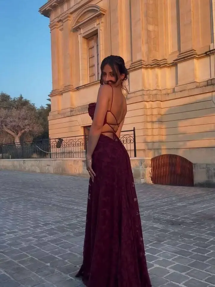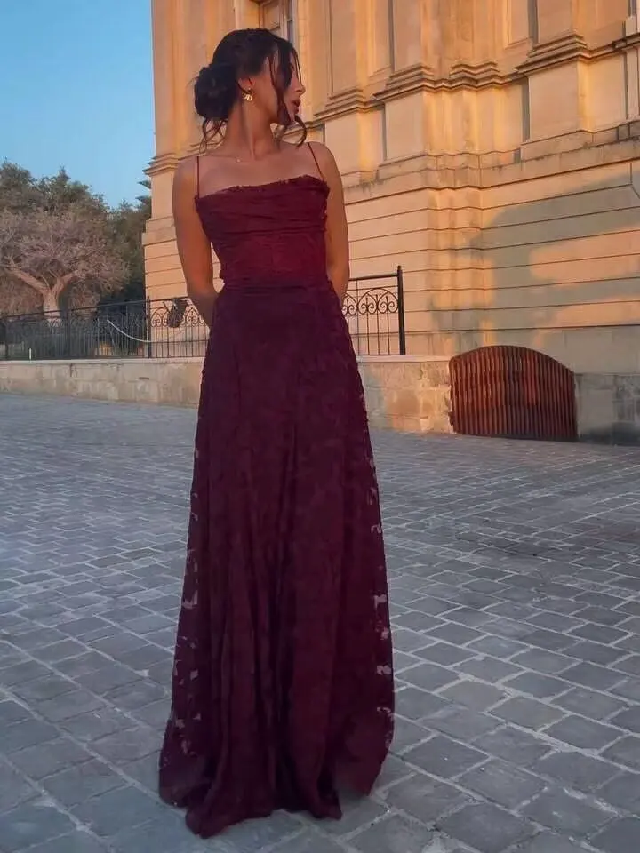 • Floral lace fabrication• Slim-fit bodice with structured shaping• Adjustable lace-up open back• Spaghetti shoulder straps• High-waisted silhouette• Full-length flowing skirt