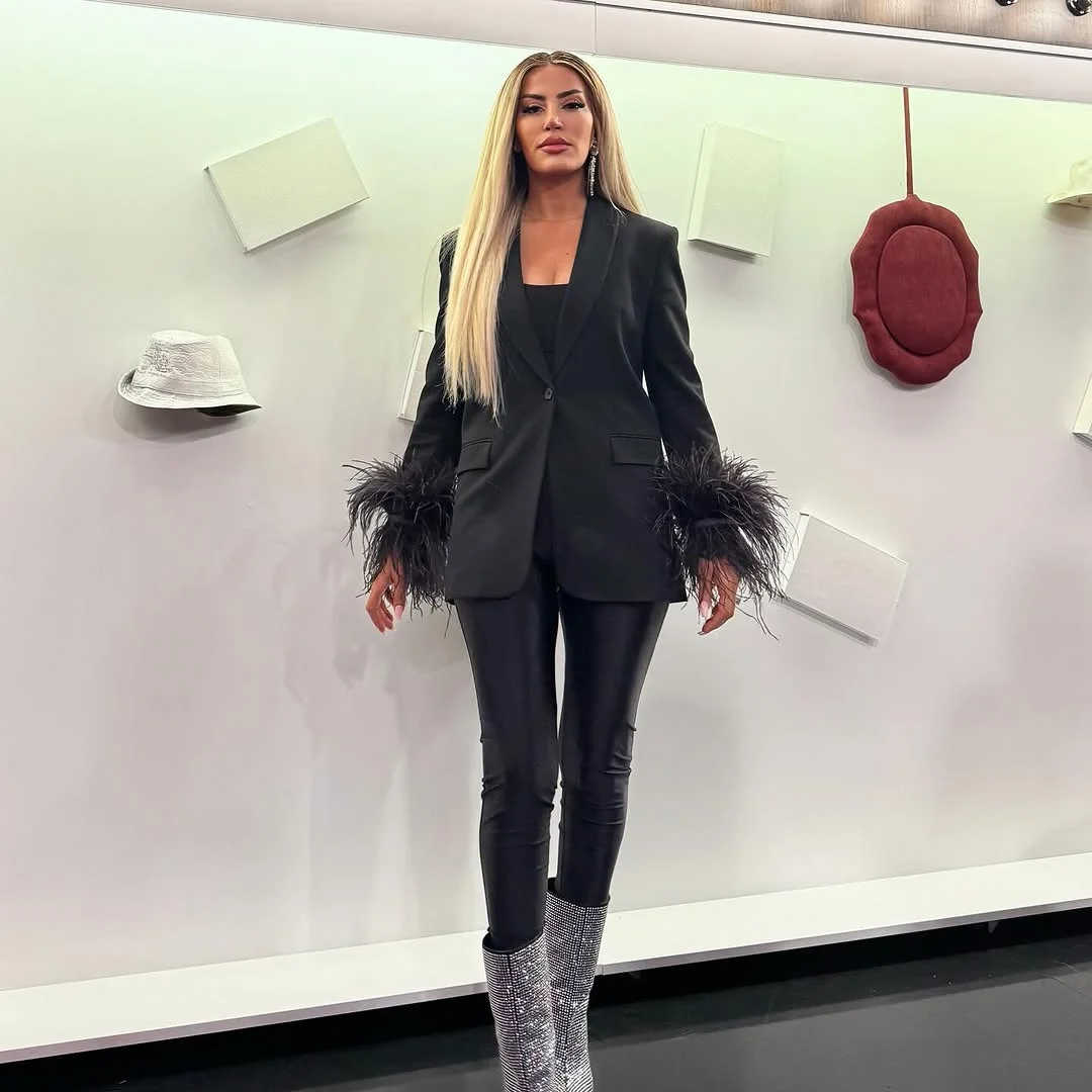 This bold blazer dress brings instant glamour and edge. The tailored structure creates a powerful silhouette while the feather details add showstopping drama. Perfect for cocktail parties, nightclub events, birthday celebrations, or any evening where you want to own the spotlight. Pair with strappy heels and statement earrings for a look that's confident, sexy, and unforgettable.