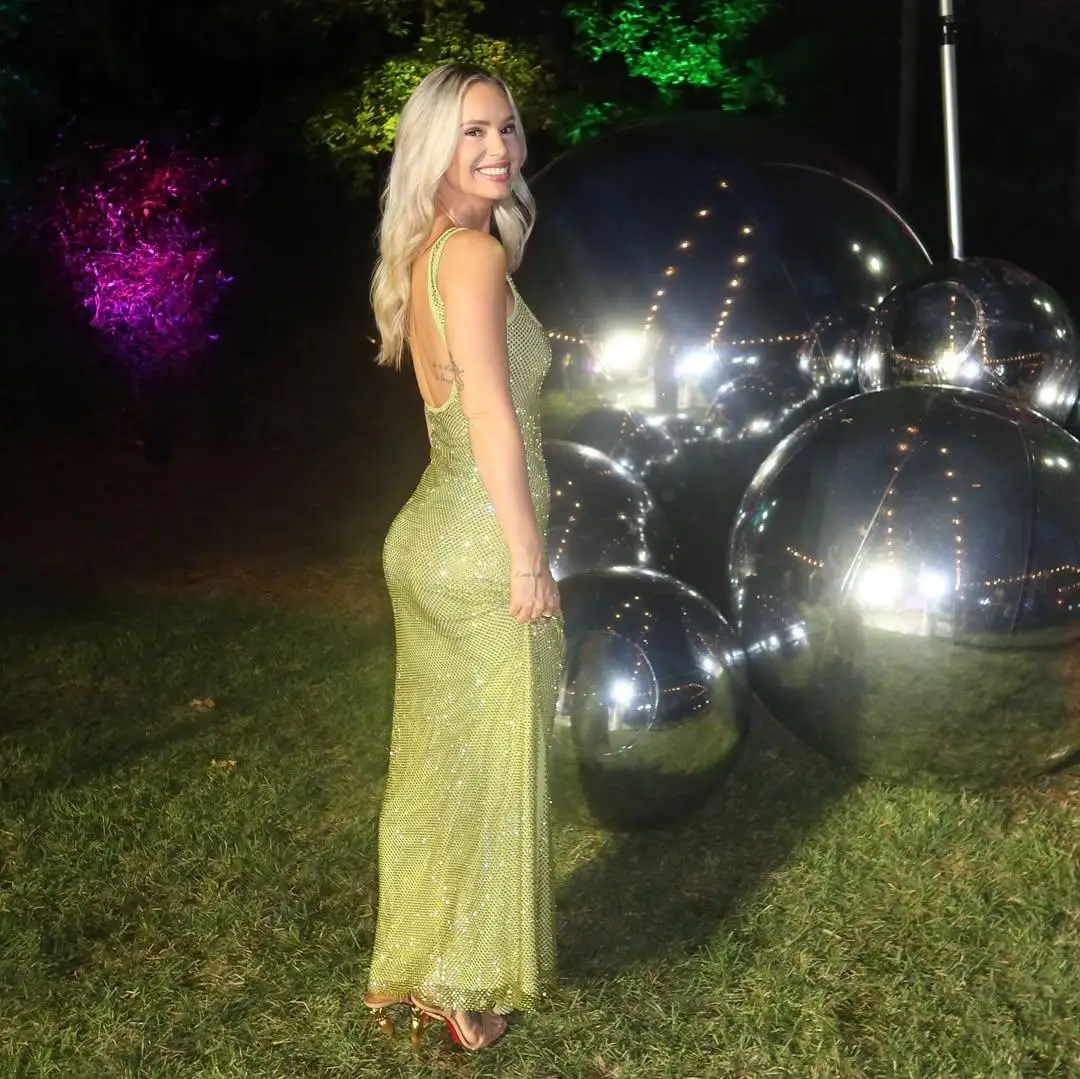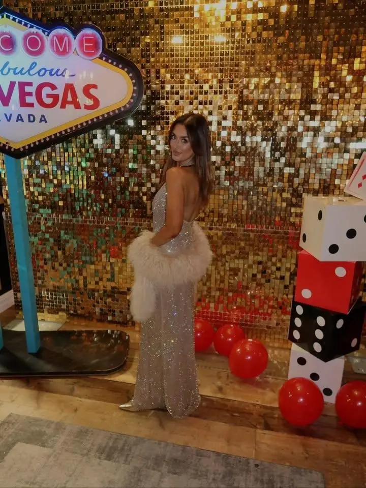 Die Elena ist so geschnitten, dass sie dem Körper präzise folgt. Ein tiefer Neckholder-Ausschnitt rahmt das Dekolleté ein, bevor er in eine klare, ununterbrochene Säule übergeht, die die Figur von der Brust bis zum Saum umspielt. Die vollständig mit Pailletten besetzte Oberfläche erzeugt einen fließenden, spiegelähnlichen Effekt, der bei jeder Bewegung das Licht einfängt und gleichzeitig ein stromlinienförmiges Profil beibehält. Der offene Rücken sorgt für eine auffällige und dennoch ausgewogene Silhouette – sinnlich ohne Übermaß, dramatisch ohne Volumen.