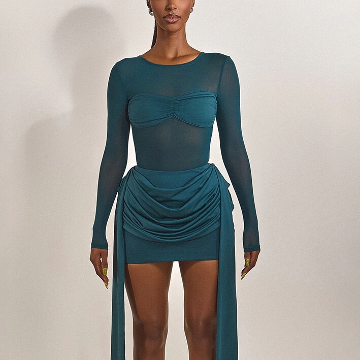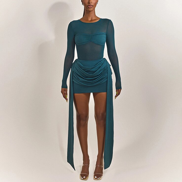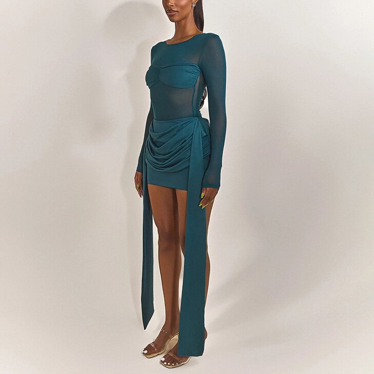 Neues sexy Minikleid mit Netzstoffeinsätzen, langen Ärmeln und Schleifenbesatz