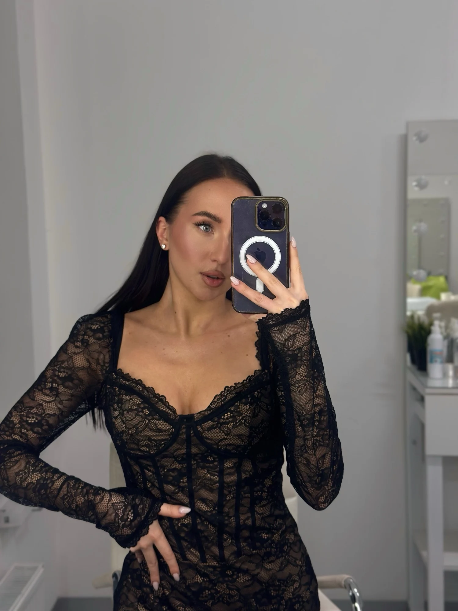 Pair with minimalist heels and understated jewelry to let the lace detailing take center stage. Ideal for evening events, intimate gatherings, or elevated street-fashion styling.